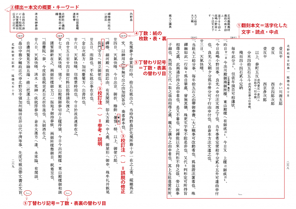 「史料纂集」の中から『北野社家日記』の版面を上に掲げた(図1)。「史料纂集」の版面は基本的に以下の要素によって構成されている。