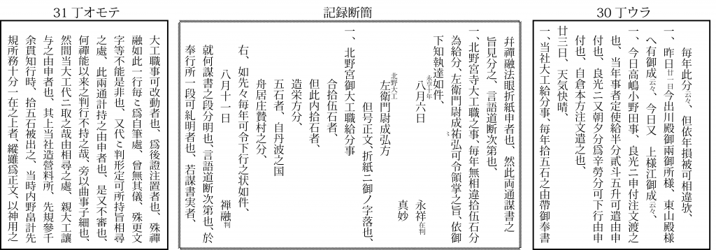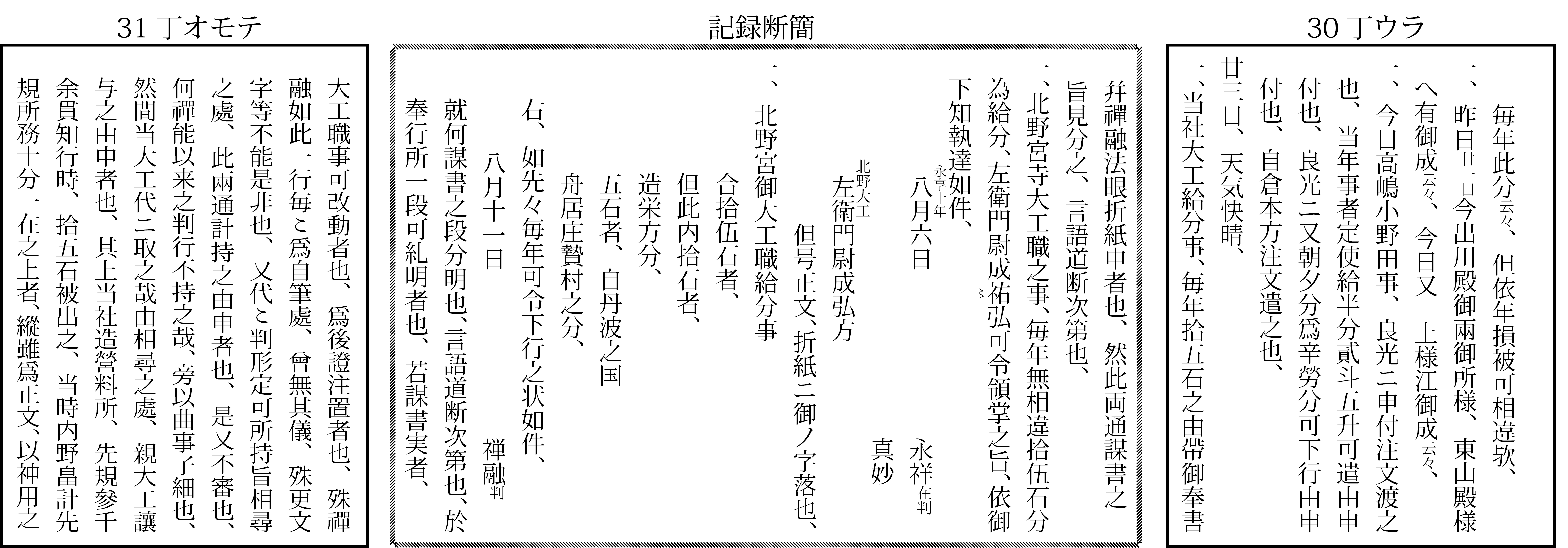 丁替わり記号は「御奉書、」と「大工職」との間にあって、ここが30丁と31丁との境目である。そしてこの部分の前後では意味が通じないことが理解できる。ここに記録断簡をはめるとどうなるかを以下に示した(図3)。