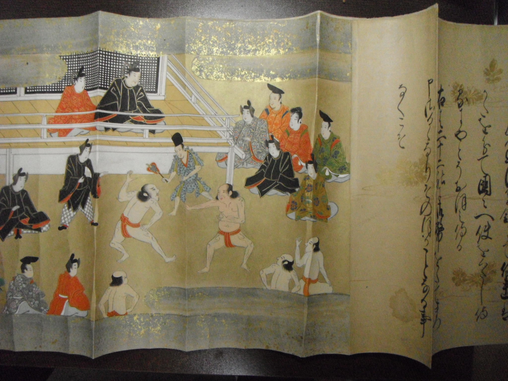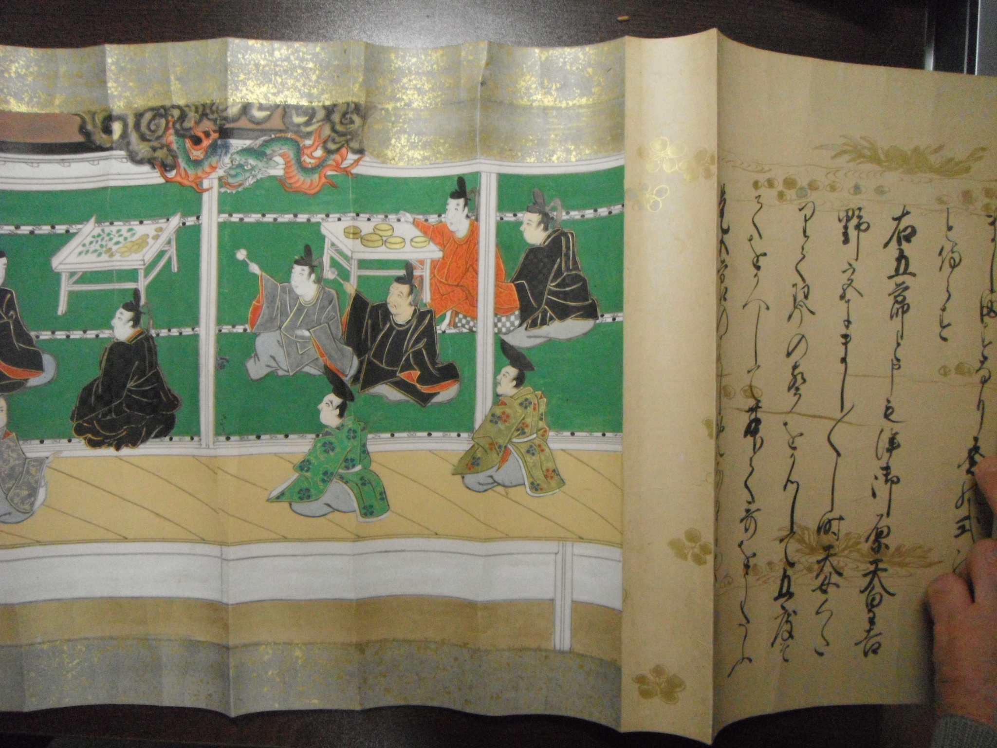 このような状況なので、『年中行事歌合』の奈良絵本・絵巻はまだまだ存在しているとは思うが、今回は比較する材料が無く、本絵巻を中心に取り上げたい。現状、箱入りの二軸であるが、内容的には足りていないので、本来はまあまあの大作だったと思われる。仮に撮影した写真なので、しわが多くて申し訳ないが、その絵には、竜や相撲の場面が描かれていておもしろい。