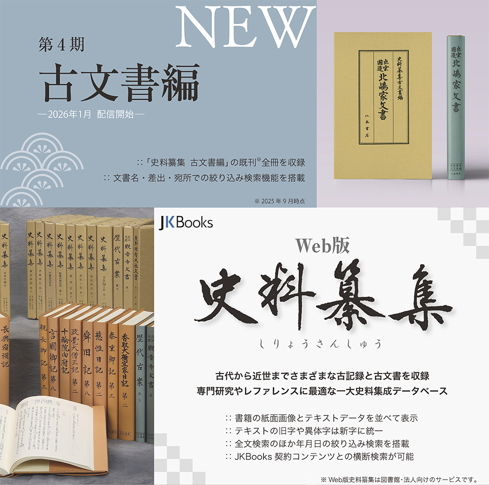 日本史・日本文学の調査研究や図書館レファレンスで大活躍する「Web版史料纂集」の第4期が、2026年1月15日よりJKBooks(ジャパンナレッジ電子書籍プラットフォーム)にて配信開始いたしました!